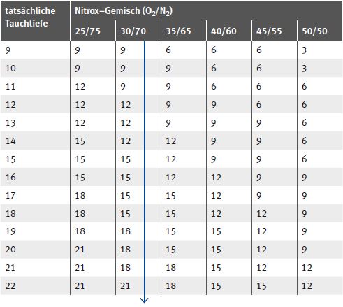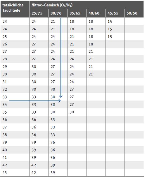 Beispiel: Festgelegt: Atemgas: Nitrox 30/70; tatsächliche Tauchtiefe: 33 m; Tauchzeit: 60 min Äquivalente Luft Tauchtiefe = 30 m (Ermittlung siehe Tabelle 2) Für die Berechnung des Sauerstoffpartialdruckes pO2 ist die tatsächliche Tauchtiefe anzusetzen, für die Bestimmung der Dekompressionszeit ist die äquivalente Tauchtiefe anzusetzen. Tabelle 9 Das Austauchen erfolgt entsprechend der Tabelle 2 der DGUV Vorschrift 40