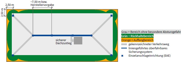 Neu zu errichtende, zu sanierende oder in der Nutzung geänderte Dachflächen müssen im Hinblick auf die späteren Instandhaltungsarbeiten so geplant werden, dass sie grundsätzlich einen sicheren Zugang haben. Insbesondere durch permanente Absturzsicherungssysteme (bauliche Maßnahmen wie Brüstung, Geländer, Attika oder Anschlageinrichtungen) wird, nach dem Rangfolgenprinzip der Schutzmaßnahmen (STOP-Prinzip) § 4 des Arbeitsschutzgesetzes, ein sicheres Begehen und Arbeiten auf der Dachfläche ermöglicht. Die Absturzsicherungen sind in der Regel permanent mit dem Bauwerk verbunden bzw. verbleiben auf dem Bauwerk. Zu Wartungsarbeiten zählen alle Arbeiten, die in regelmäßigen Abständen von weniger als 3 Jahren durchgeführt werden.