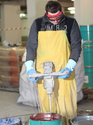 Bei der Mischung der Komponenten besteht ein beträchtliches Gefährdungspotenzial durch Hautkontakt und Einatmen. Der Mischbehälter sollte auf eine ebene Fläche gestellt werden, denn durch kippende Behälter kann es zu Spritzern oder zum Verschütten kommen.