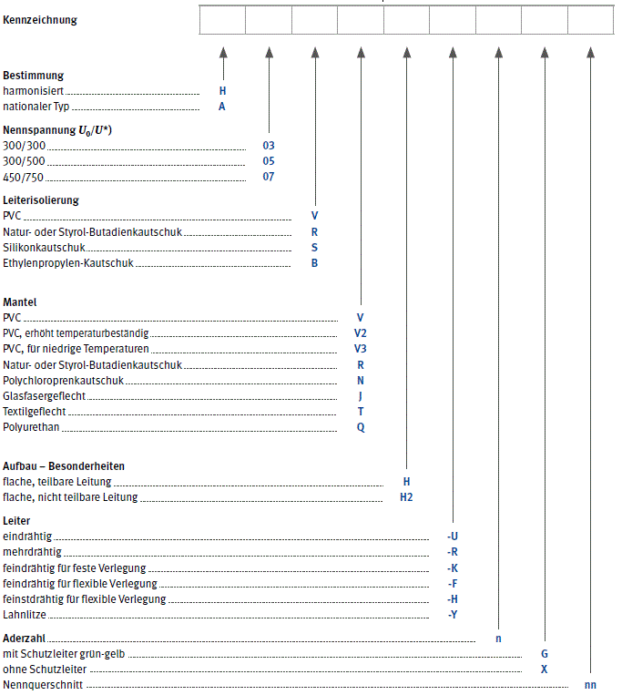 Tabelle 1 Kurzzeichen für harmonisierte Leitungen