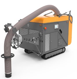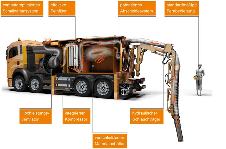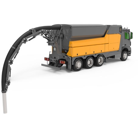 Beim vollständigen Ausfahren des hydraulisch geführten Gelenkschlauchträgers sind Reichweiten des Saugbaggers von sechs bis sieben Metern möglich. Dadurch kann der Bagger von einem sicheren Standort per Funkfernbedienung gesteuert werden. Der Saugschlauch wird bis zur Saugkrone fest geführt und kann dadurch genauestens an der Saugstelle positioniert werden.