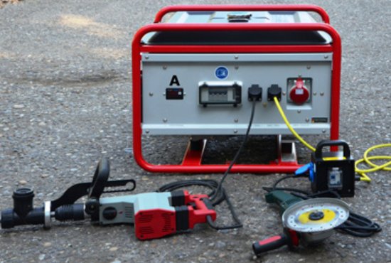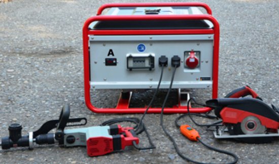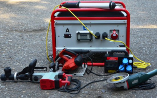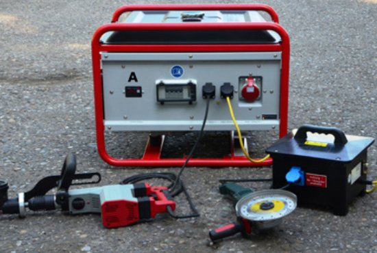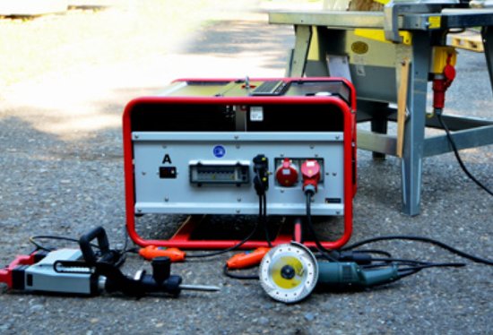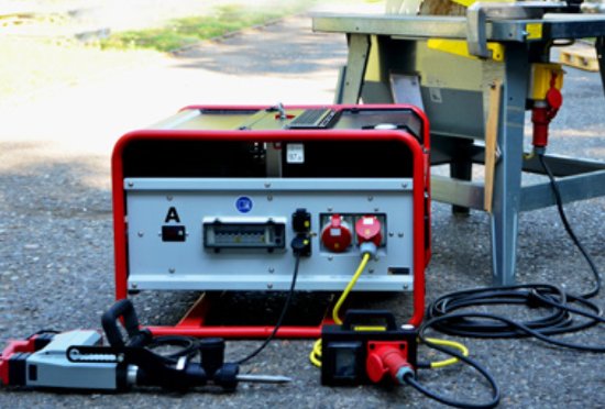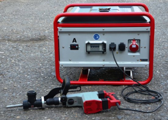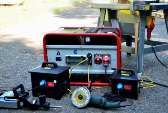 Abb. 27 Drei Betriebsmittel – Baustellenkreissäge direkt angeschlossen, Abbruchhammer und Winkelschleifer hinter jeweils einem Trenntransformator betrieben