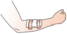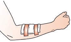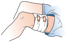 Mit Heftpflasterstreifen, Mullbinden oder Dreiecktüchern kann die Befestigung erfolgen.