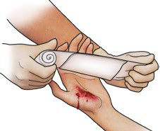 Mit einer Mullbinde umwickeln Sie die Wundauflage/n.