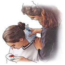 Die betroffene Person soll ihren Kopf leicht vornüberbeugen, damit das Blut abfließen kann (Bild).