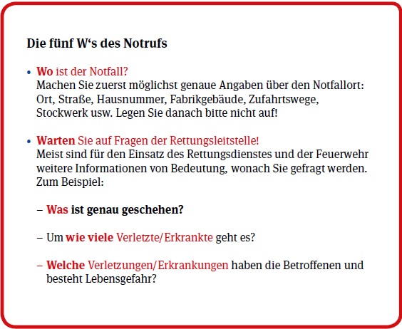 Der Notruf muss klar und knapp alle Angaben enthalten, die erforderlich sind, um gezielt und ohne Zeitverlust die notwendigen Rettungseinheiten zum Einsatz zu bringen und an den Notfallort leiten zu können. Nicht auflegen! Weitere Anweisungen und Unterstützung wird von der Rettungsleitstelle gegeben.
