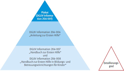 Die DGUV Information 204-001 Plakat "Erste Hilfe" der Unfallversicherungsträger stellt gleichsam die textlich minimierte Spitze einer Pyramide dar. Die weiterführende DGUV Information 204-006 "Anleitung zur Ersten Hilfe" in Heftform greift die Inhalte des Plakates auf und führt sie textlich in Heftform ausführlicher aus. Die Basis der Pyramide bilden die Handbücher zur Ersten Hilfe (DGUV Information 204-007 und 204-008). In diesen Handbüchern sind alle relevanten Inhalte der Erste-Hilfe-Ausbildung zusammengefasst, sodass den ausgebildeten Ersthelfern und Ersthelferinnen ein handliches Nachschlagewerk für den täglichen Gebrauch zur Verfügung steht.