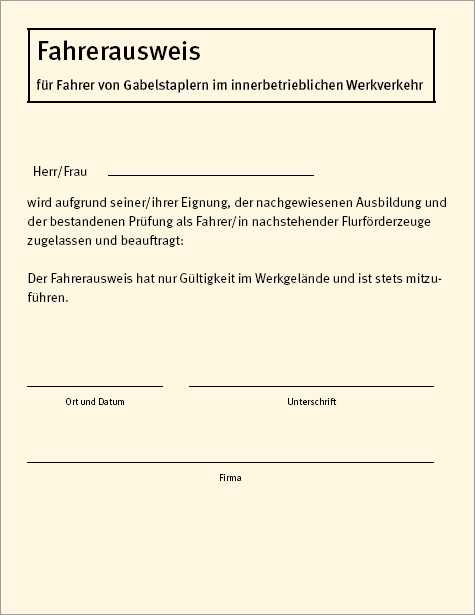 Zur Durchführung der Ausbildung ist der Berufsgenossenschaftliche Grundsatz "Ausbildung und Beauftragung der Fahrer von Flurförderzeugen mit Fahrersitz und Fahrerstand" (BGG 925) zu berücksichtigen. Nach bestandener Ausbildung ist den Teilnehmern ein Ausbildungsnachweis auszuhändigen (Bild 1-1).