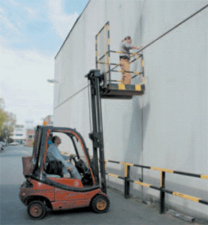 Das Verfahren des Gabelstaplers mit angehobener oder besetzter Arbeitsbühne ist nicht zulässig.