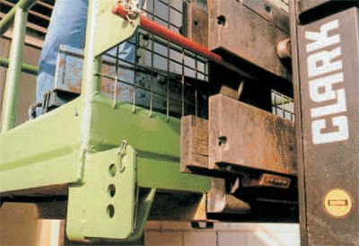 Die Arbeitsbühne ist zum Schutz gegen Absturz formschlüssig am Lastaufnahmemittel zu sichern (Bild 8-3) und mit einem mindestens 1 m hohen Geländer, bestehend aus Handlauf, Knie- und Fußleiste, zu versehen.