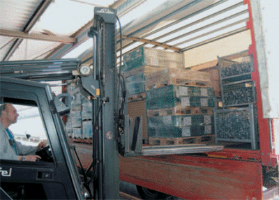 Das Entladen von Lkws, Anhängern, Wechselbrücken oder Kleintransportern mit Gabelstaplern erfolgt in den meisten Fällen seitlich (Bild 8-5). Bevor der Staplerfahrer mit der Be- oder Entladung beginnt, hat er sich davon zu überzeugen, dass diese Fahrzeuge bzw. Geräte gegen Wegrollen und Umkippen gesichert sind.