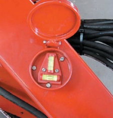 Jede fahrbare Hubarbeitsbühne hat eine Einrichtung (z. B. Nivellierwaage, Dosenlibelle), die anzeigt, ob die Neigung des Untergestelles in dem vom Hersteller zugelassenen Grenzwert liegt (Bild 3-5). Sie ist für die standsichere Justierung der Hubarbeitsbühne von großer Bedeutung. Diese Nivellierhilfsmittel befinden sich in unmittelbarer Nähe der Bedienelemente für die Abstützungen. Viele Hubarbeitsbühnen besitzen Einrichtungen, die das Ausrichten des Untergestells in beiden Ebenen automatisch durchführen. Dies erfolgt durch Inclinometer und Neigungssensoren.