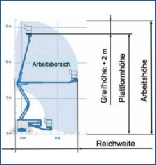 Vor dem Einsatz bzw. vor der Anmietung ist von der verantwortlichen Person zu klären, welche Tätigkeiten ausgeführt werden sollen. Die Reichweite des Arbeitskorbes der Hubarbeitsbühne muss zu den auszuführenden Tätigkeiten und zur örtlichen Gegebenheit passen. Zu berücksichtigen ist, dass der Unterschied zwischen Plattformhöhe und Arbeitshöhe 2 m (Greifhöhe) beträgt (Bild 4-3).
