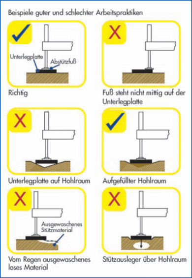 Es ist daher dringend zu empfehlen, unabhängig von der Untergrundbeschaffenheit unter den Füßen der Abstützung geeignete Unterlegplatten einzusetzen!