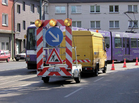 Gegebenenfalls müssen zusätzlich im Straßenverkehrsbereich Verkehrszeichen ent sprechend dem Verkehrszeichen- oder auch Regelplan (Beschilderungsplan) nach RSA 95 ˶Richtlinien für die Sicherung von Arbeitsstellen an Straßen˝ aufgestellt werden (Bild 4-8). Dieser Verkehrszeichenplan ist Teil der bereits oben genannten verkehrsrechtlichen Anordnung. Bezüglich weitergehender Informationen zur ˶Verkehrssicherung an Baustellen˝ wird auf die gleichnamige Informationsschrift der BG BAU verwiesen.