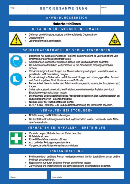 Muster einer Betriebsanweisung für Hubarbeitsbühnen