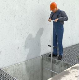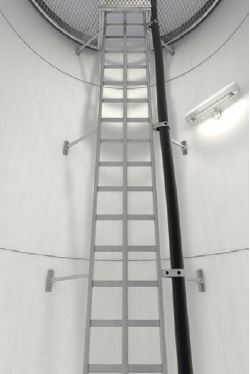 | Als Steiggang in Kunststoffschächten sowie in Bereichen mit elektrischen Gefährdungen und wo es auf chemische Beständigkeit ankommt, haben sich Steigleitern aus GFK bewährt. |