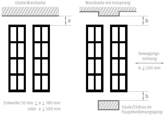 Verfahrbare Regale und Schränke müssen so eingebaut sein, dass sie keine Gefahrstellen mit Bauwerksteilen oder sonstigen Einrichtungen bilden. Der Abstand zu Wandvorsprüngen, benachbarten Regalen und Schränken sowie ähnlichen Einrichtungen muss mindestens 0,5 m betragen, sofern keine besonderen Schutzeinrichtungen vorhanden sind. Der Abstand verfahrbarer Einheiten von ebenen Wänden muss mindestens 50 mm, darf jedoch nicht mehr als 180 mm betragen. Die ebenen Wände dürfen nicht nachgiebig sein und müssen mindestens 2,0 m über der Aufstandsfläche hoch sein. Falls zur Decke Quetsch- und Scherstellen entstehen können, muss der Abstand von der Oberkante der beweglichen Teile zur Decke mindestens 100 mm entsprechen.