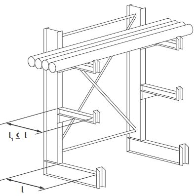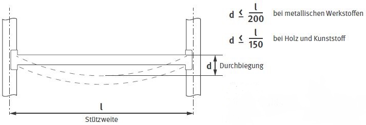 Die maximale Durchbiegung der tragenden Elemente von Lagereinrichtungen bei Einbringung der zulässigen Nutzlast darf für metallische Werkstoffe höchstens 1/200, für alle anderen Werkstoffe höchstens 1/150 ihrer Stützweite betragen (siehe auch Abbildung 2).