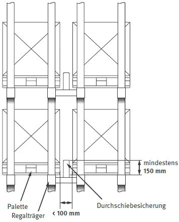 Doppel-Regale, die von zwei Seiten mit nicht leitliniengeführten Fördermitteln beladen werden, müssen Durchschiebesicherungen aufweisen, die bis zu einer Höhe von mindestens 150 mm wirksam sind (siehe auch Abbildung 7a).