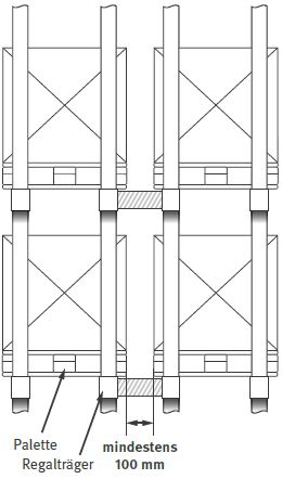 Der Abstand der Auflagen in den Regalgassen muss unabhängig vom Abstand der Stützen so gewählt sein, dass ein Auflagemaß von 30 mm auf jeder der beiden Palettenseiten nicht unterschritten werden kann.