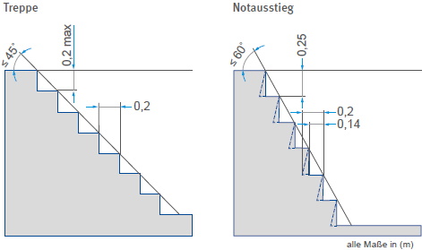 Die Treppen dürfen nicht steiler als 45° sein. Für Treppen, die ausschließlich als Notausstiege vorgesehen sind, ist ein Neigungswinkel bis 60° zulässig (Abb. 4-1).