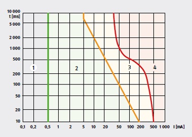Von diesen Werten an wird die Körperdurchströmung für den Menschen so gefährlich, dass irreversible Schäden auftreten können. Zusätzlich zum Basisschutz muss eine zweite Schutzmaßnahme als Fehlerschutz (z. B. Schutztrennung) umgesetzt werden.