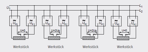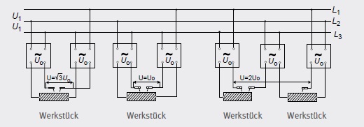 Schweißen mehrere Schweißerinnen und Schweißer mit mehreren Stromquellen an einem Werkstück oder an mehreren elektrisch leitend miteinander verbundenen Werkstücken, so können unzulässig hohe Berührungsspannungen auftreten. Wenn Schweißstromquellen und Zusatzgeräte oder mehrere Schweißstromquellen zusammengeschaltet sind, gilt die resultierende Spannung als Leerlaufspannung. Sie darf bei keiner Einstellung und Schaltung von Stromquellen und Zusatzgeräten die festgelegten Höchstwerte der Leerlaufspannung überschreiten.