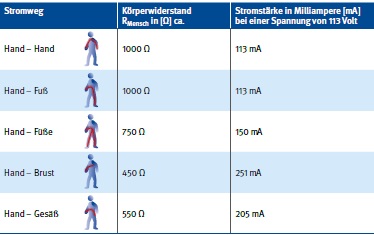 Tabelle 1 Körperdurchströmungen bei einer Berührungsspannung von 113 Volt (maximal zulässige Spannung im Schweißstromkreis)