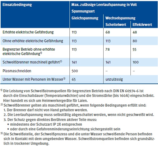 Wenn der Lichtbogen brennt, tritt – je nach Schweißverfahren und Art der verwandten Elektrode – eine Arbeitsspannung von 15 bis 40 V auf. Wenn der Lichtbogen nicht brennt, liegt zwischen den Anschlussstellen der Schweißleitungen die Leerlaufspannung an. Sie ist wesentlich höher als die Arbeitsspannung. Die Leerlaufspannung wird benötigt, um den Lichtbogen zünden zu können. Die zulässigen Höchstwerte der Leerlaufspannung (siehe Abb. 3-6) sind für verschiedene Einsatzbedingungen so festgelegt, dass sie alle Schweißaufgaben ermöglichen, aber unnötig große Gefährdungen vermeiden. Die Höchstwerte sind für Gleich- und Wechselspannung als Scheitelwerte festgelegt. Für Wechselspannung sind zusätzlich die Effektivwerte einzuhalten.