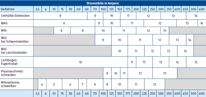 Hinweise zur richtigen Anwendung der Schutzstufen bei den verschiedenen Lichtbogenschweißverfahren in Abhängigkeit von der Stromstärke gibt die aus DIN EN 169 Teil 1 wiedergegebene Tabelle (Tabelle 3).
