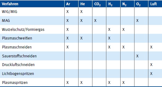 Schutzgase, Schutzgasgemische und Formiergase sind Prozessgase, die beim Schweißen eingesetzt werden, um primär das Schmelzbad vor unkontrollierten Reaktionen mit dem Luftsauerstoff zu schützen (Tabelle 4). Je nach zu verschweißenden Werkstoffen werden Inert- oder Aktivgase (z. B. Ar, He, CO2) verwendet. Aktivgase haben zusätzlich die Aufgabe, das Reaktionsverhalten des Schweißbades oxidierend oder reduzierend zu beeinflussen. Formiergas kann als Wurzelschutz und zur verbesserten Nahtqualität beim Schweißen dienen. Bei den Schneidverfahren wird Luft u. a. zum Austrag (Ausblasen) der Schmelze verwendet.