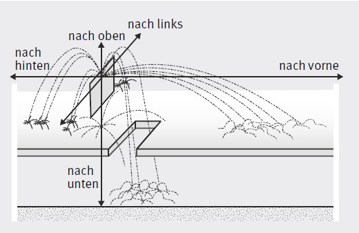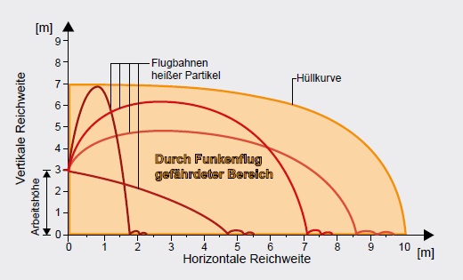 Ausdehnung und Form der durch Funkenflug gefährdeten Bereiche ergeben sich aus den Flugbahnen der heißen Partikel (siehe Abb. 8-2).