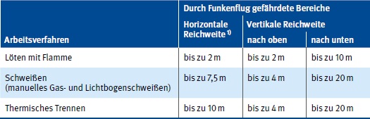 Die Angaben über die Reichweiten sind Anhaltswerte zur Abschätzung des Funkenflugs. Sie berücksichtigen die Gesamtreichweite und das Zündvermögen heißer Metall- und Schlacketeilchen bei fachgerechter Ausführung der Arbeiten und ungünstigen Arbeitsbedingungen (siehe Tabelle 5).