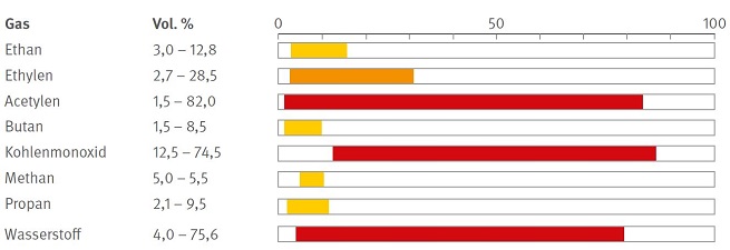 Abb. 2 Explosionsbereiche der Brenngase der Autogentechnik