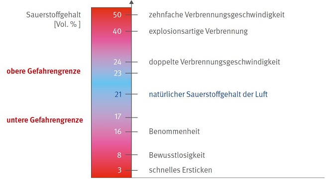 Bei weniger als 18 Volumenprozent Sauerstoff in der Umgebungsluft spricht man von Sauerstoffmangel. Häufig wird nicht bedacht, dass jede Brenngasflamme neben dem zugemischten Sauerstoff aus Druckgasflaschen oder Entnahmestellen auch Sauerstoff aus der Umgebung für eine vollständige Verbrennung benötigt.