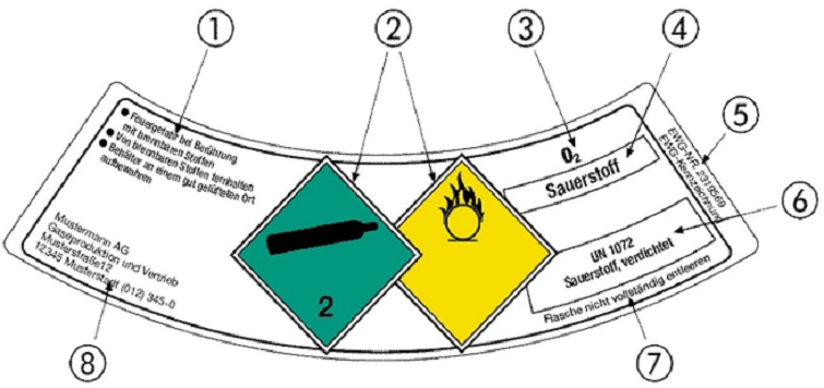 Die wichtigsten Informationen zum Inhalt der Gasflaschen, der Gasbenennung, den Eigenschaften, dem Hersteller und zu Gefahrensätzen (H-Sätze) und Sicherheitssätzen (P-Sätze) enthält der Gefahrgutaufkleber auf der Flaschenschulter (Abb. 4).