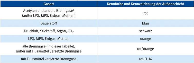 Tabelle 2 DIN EN ISO 3821 gibt folgende Kennzeichnungsfarben für Gummischläuche für Schweißen, Schneiden und verwandte Verfahren vor: