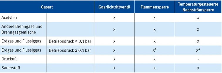 Sicherheitseinrichtungen sollten beim Schweißen, Schneiden und verwandten Verfahren entsprechend nachfolgender Tabelle eingesetzt werden. Je nach Schutzziel können die Sicherheitseinrichtungen direkt am Brenner, in den Schlauchleitungen oder am Ausgang der Druckregler eingebaut werden.