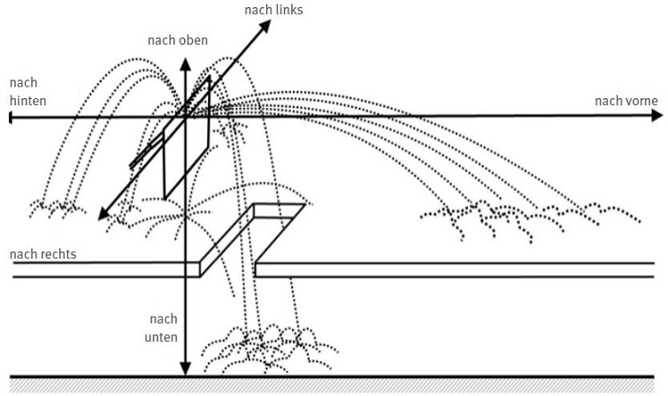 Die von der Arbeitsstelle wegfliegenden oder abtropfenden Partikel erreichen dabei je nach Arbeitsverfahren, Arbeitsweise und den jeweiligen örtlichen Gegebenheiten durch ihre Flugbewegung und die sich daran anschließenden Roll-, Hüpf- und Gleitbewegungen häufig erstaunlich große Reichweiten (Abb. 13).