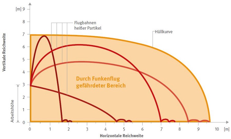 Abb. 14 Ausdehnung des durch Funkenflug gefährdeten Bereichs beim thermischen Trennen in einer Arbeitshöhe von 3 m