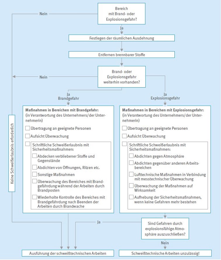 Abb. 16 Schematisches Vorgehen bei der Ermittlung von Sicherheitsmaßnahmen für Schweißarbeiten in Bereichen mit Brand- oder Explosionsgefahr.