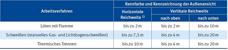 Die Tabelle 4 gibt Anhaltswerte für durch Funkenflug gefährdete Bereiche bei verschiedenen Arbeitsverfahren. Grundlage dieser Angaben sind immer fachgerechte Ausführung der Arbeiten und richtige Handhabung der Autogengeräte, das heißt auch Einstellung der korrekten Arbeitsdrücke und Flammenbilder des Brenners.