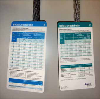 Die Tragfähigkeitstabellen der Berufsgenossenschaft (siehe BG-Information „Belastungstabellen für Anschlagmittel aus Rundstahlketten, Stahldrahtseilen, Rundschlingen, Chemiefaserhebebändern, Chemiefaserseilen, Naturfaserseilen“ [BGI 622]) geben die Tragfähigkeit der Anschlagseile entsprechend DIN EN 13414 an.