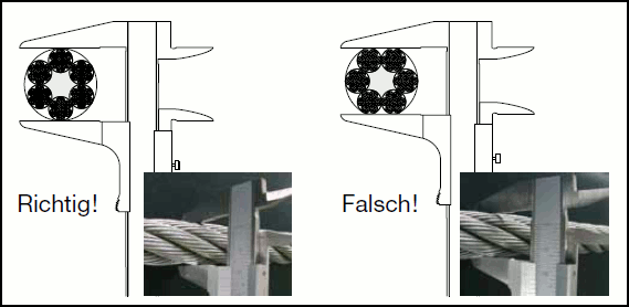 Soll die Tragfähigkeit eines Seiles durch die Bestimmung des Durchmessers mit Hilfe der Belastungstabellen bestimmt werden, so ist das Seil diagonal über dem größten Durchmesser zu messen (Bild 8-3).