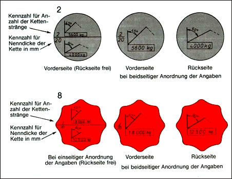 Die Güteklassen der Ketten sind durch Kettenanhänger, die sich in Form und Farbe unterscheiden, gekennzeichnet (Bild 11-3). Die runden Kettenanhänger gelten für Güteklasse 2, ansonsten zeigt die Anzahl der Ecken des Kettenanhängers die Güteklasse an. Die achteckigen Anhänger der Ketten der Güteklasse 8 sind üblicherweise rot.