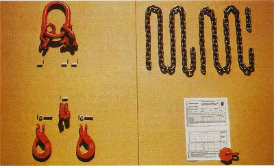 Ketten und Einzelteile der Güteklassen 10 und 12 sind herstellerbezogen gefärbt und sollen — schon wegen der Maßabweichungen (Schlitzbreite, Ketteninnenmaß und Bolzendicke) — und der Typprüfung nur mit Teilen desselben Herstellers kombiniert werden. Auch aus Produkthaftpflichtgründen kann es keine andere Lösung geben. Sie dürfen entsprechend den Herstellerangaben auf dem Sonderanhänger belastet werden.