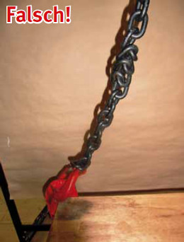 Bild 22-2: Haken ist in eine zu kleine Öse eingehängt. Haken und Öse werden verbogen. Außerdem besteht die Gefahr des unbeabsichtigten Aushängens.