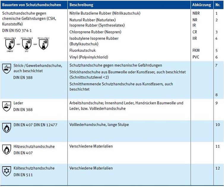 Tabelle 6-1 Schutzhandschuhe – Einteilung nach Eigenschaften