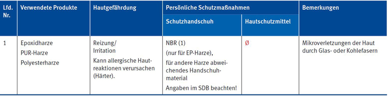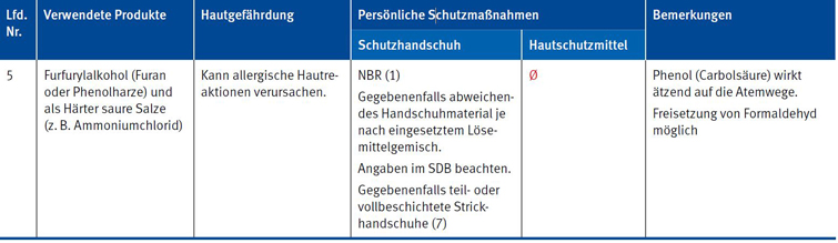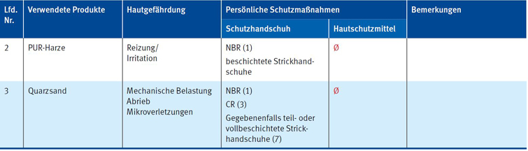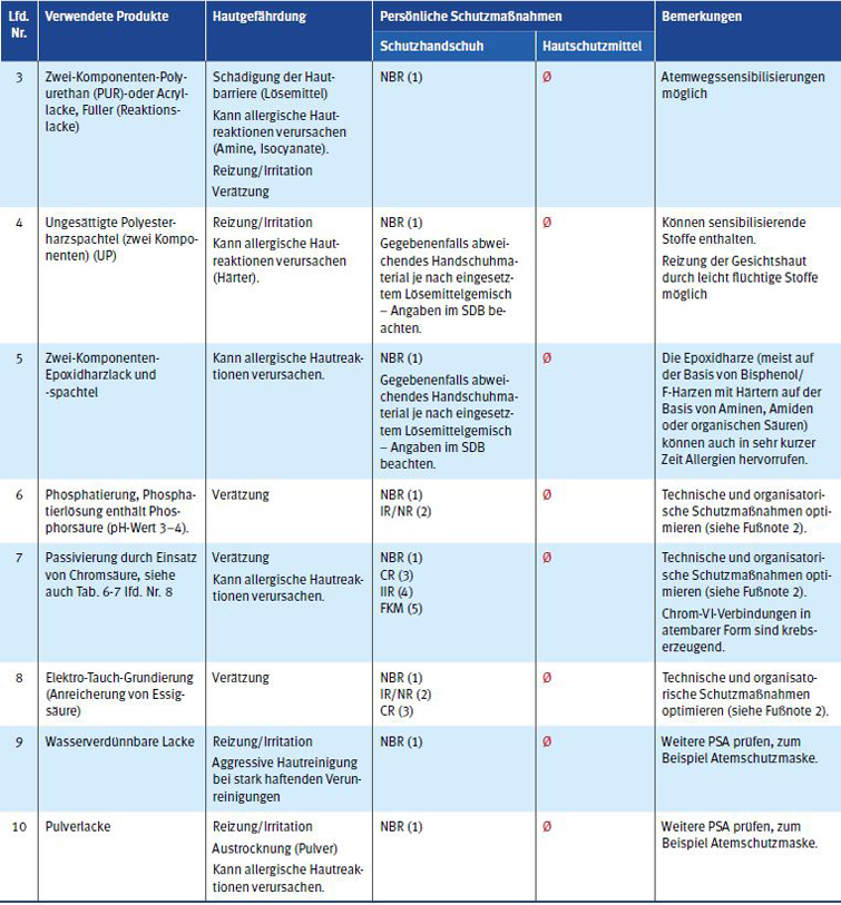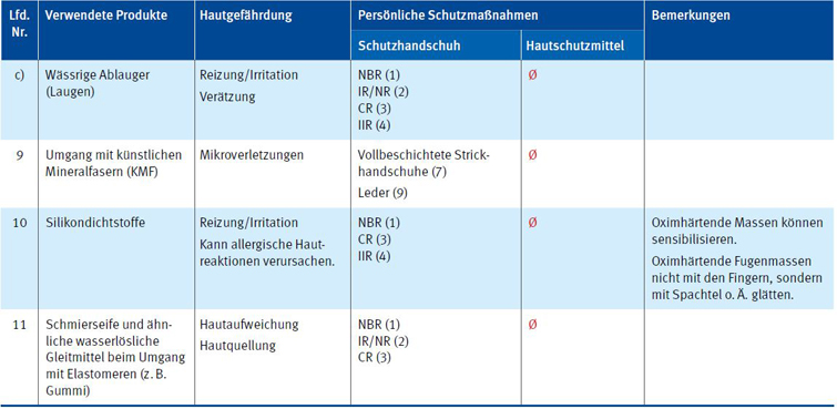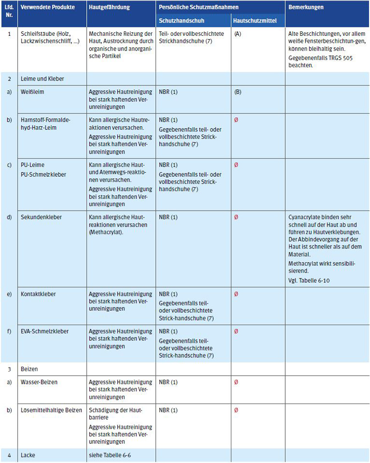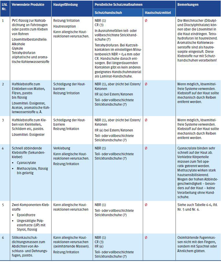 Tabelle 6-10 Hautgefährdung und Maßnahmen beim Verarbeiten von Klebstoffen und Dichtungsmassen